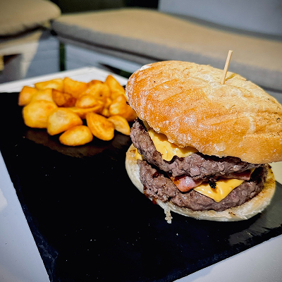 Doble carne Angus 180gr + doble cheddar + bacon. Potencia pura. Ideal para devorar sin culpa.