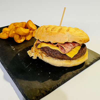 Carne Angus 180gr + cheddar + doble bacon ahumado + toque de salsa BBQ.